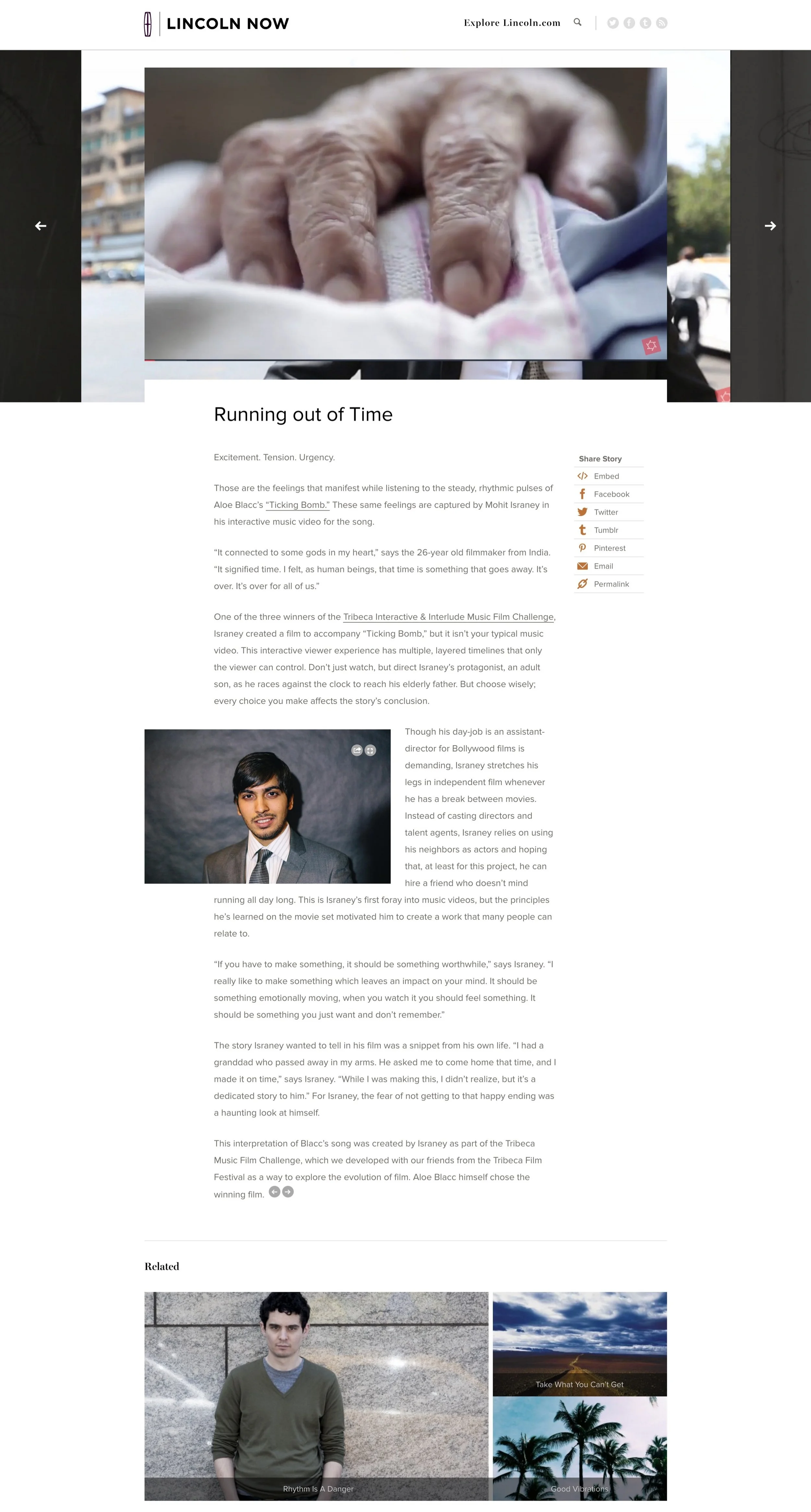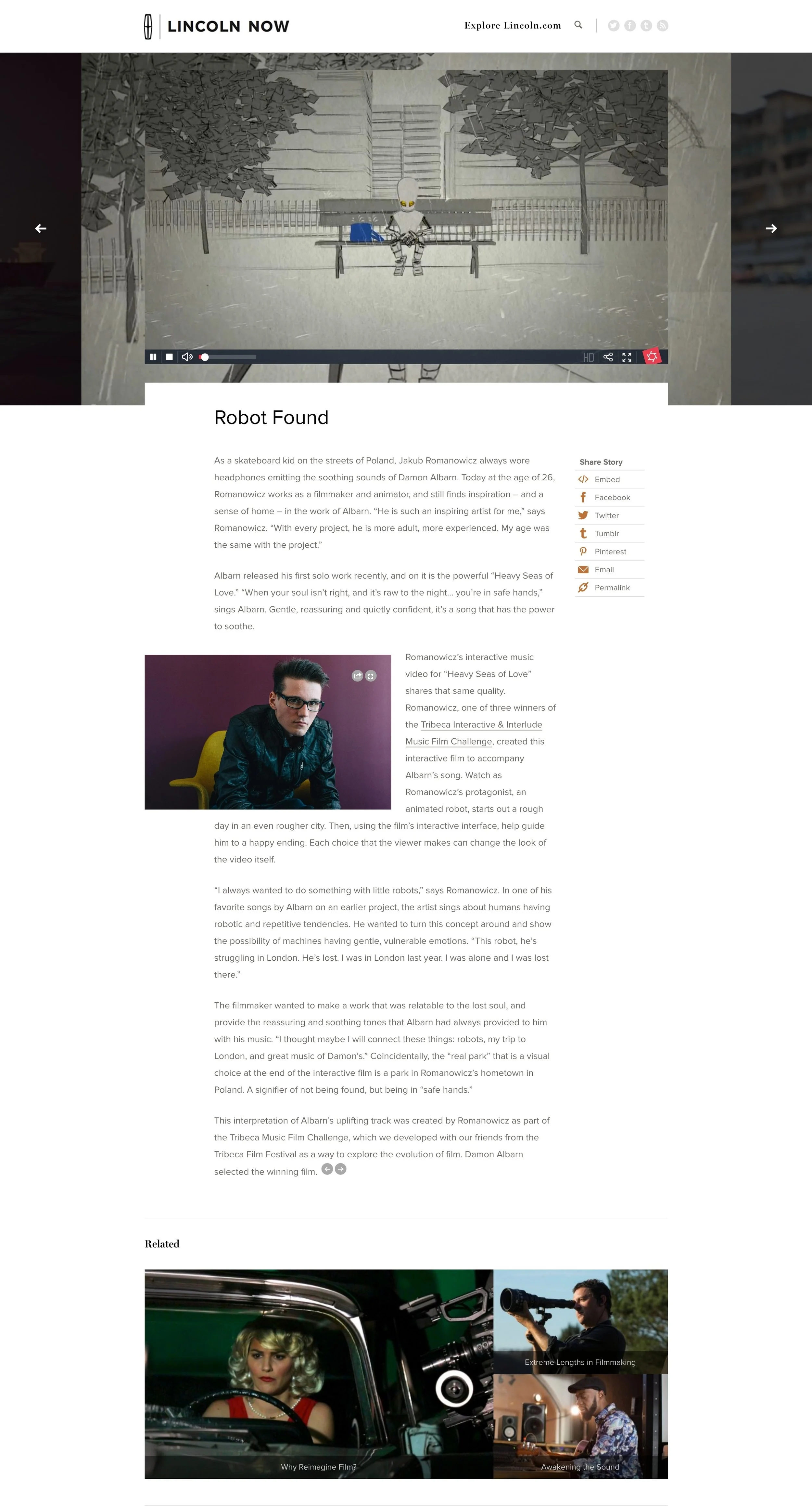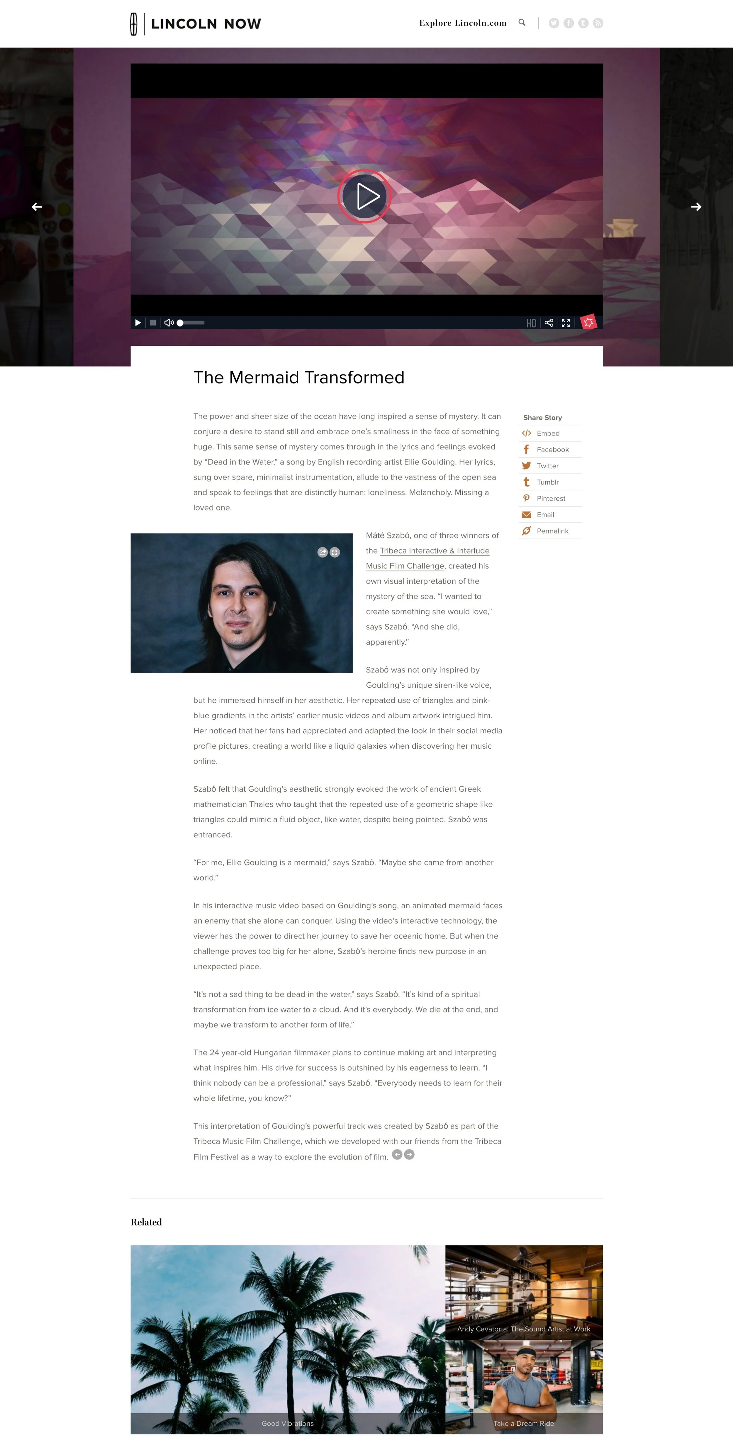 Through the Tribeca Interactive & Interlude Music Film Challenge, which we developed with our friends from the Tribeca Film Festival as a way to explore the evolution of film, three filmmakers created interactive music videos set to modern music from Damon Albarn, Aloe Blacc, and Ellie Goulding to show an evolution of film. We created content around the winners (shown in the gallery below) to show their artistry to audiences on both Lincoln Now and in the Tribeca Film Festival digital spaces.
