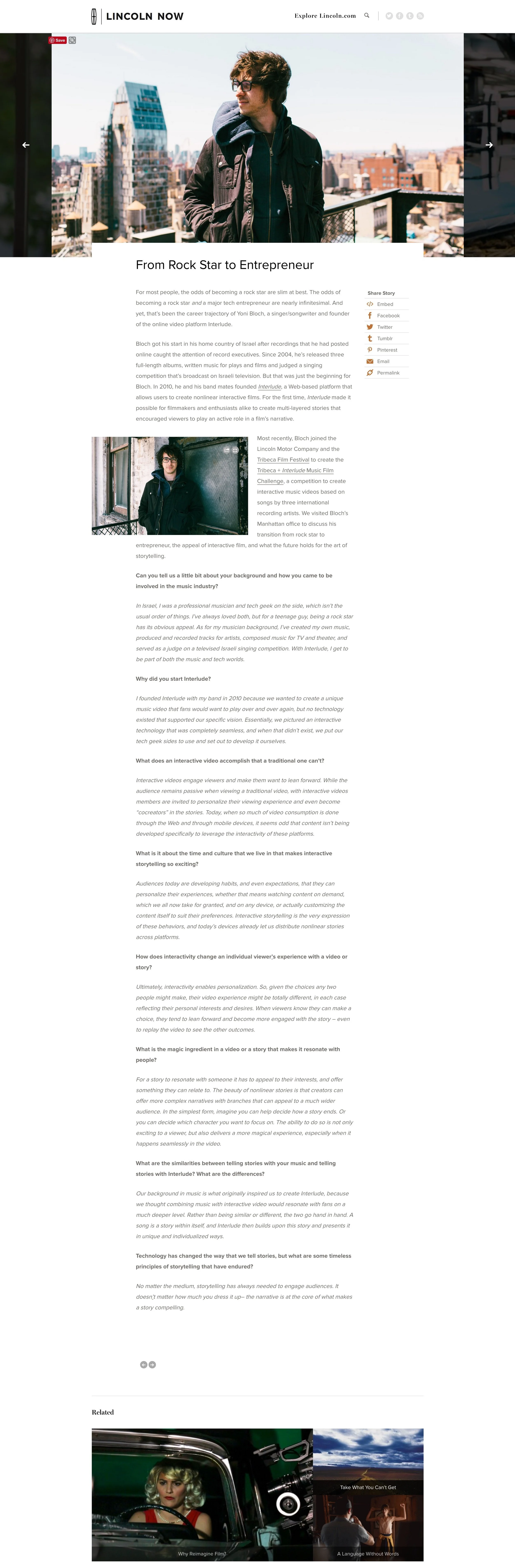 We teamed with rock star and founder of the music platform Interlude, Yoni Blach, to create the Tribeca Interactive & Interlude Music Film Challenge. We also extended his story through long-form content on LincolnNow, providing yet another inroads into the brand spaces for individuals interested in film and technology.